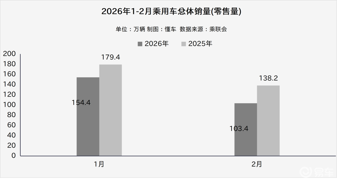 不过在聊厂商销量之前,先让我们看看汽车市场总体销量。根据乘联会(cpcaauto.com)数据,2026年2月汽车(乘用车)销量(零售)仅103.4万辆,同比下降25.4%,环比下降33.0%。
