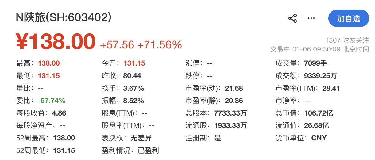 乐居财经 刘治颖 1月6日股市配资开户,陕西旅游(603402.SH)在上交所主板挂牌上市,保荐机构中金公司,开盘涨71.56%,总市值106.72亿元。