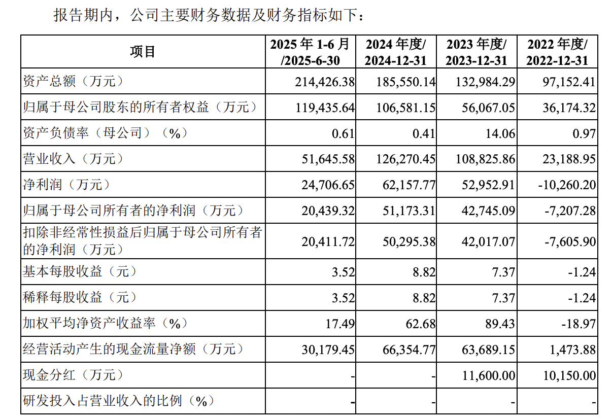 业绩方面,2022年-2024年及2025年上半年,公司分别实现营业收入2.32亿元、10.88亿元、12.63亿元、5.16亿元;归属于母公司所有者的净利润分别为-7207.28万元、4.27亿元、5.12亿元、2.04亿元。